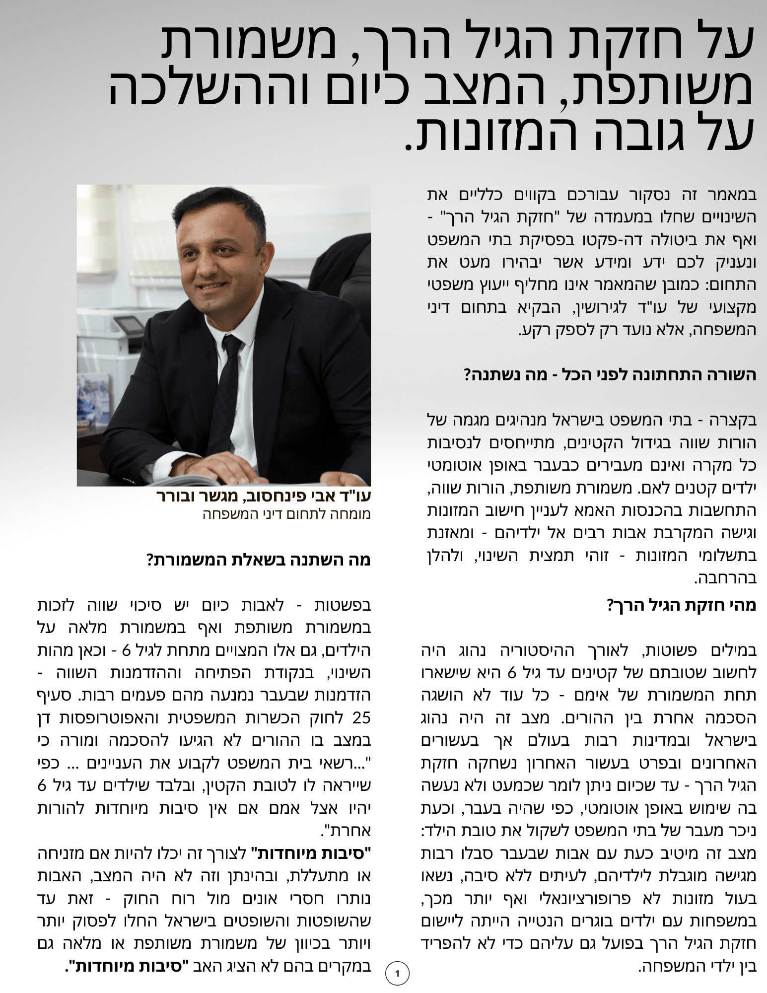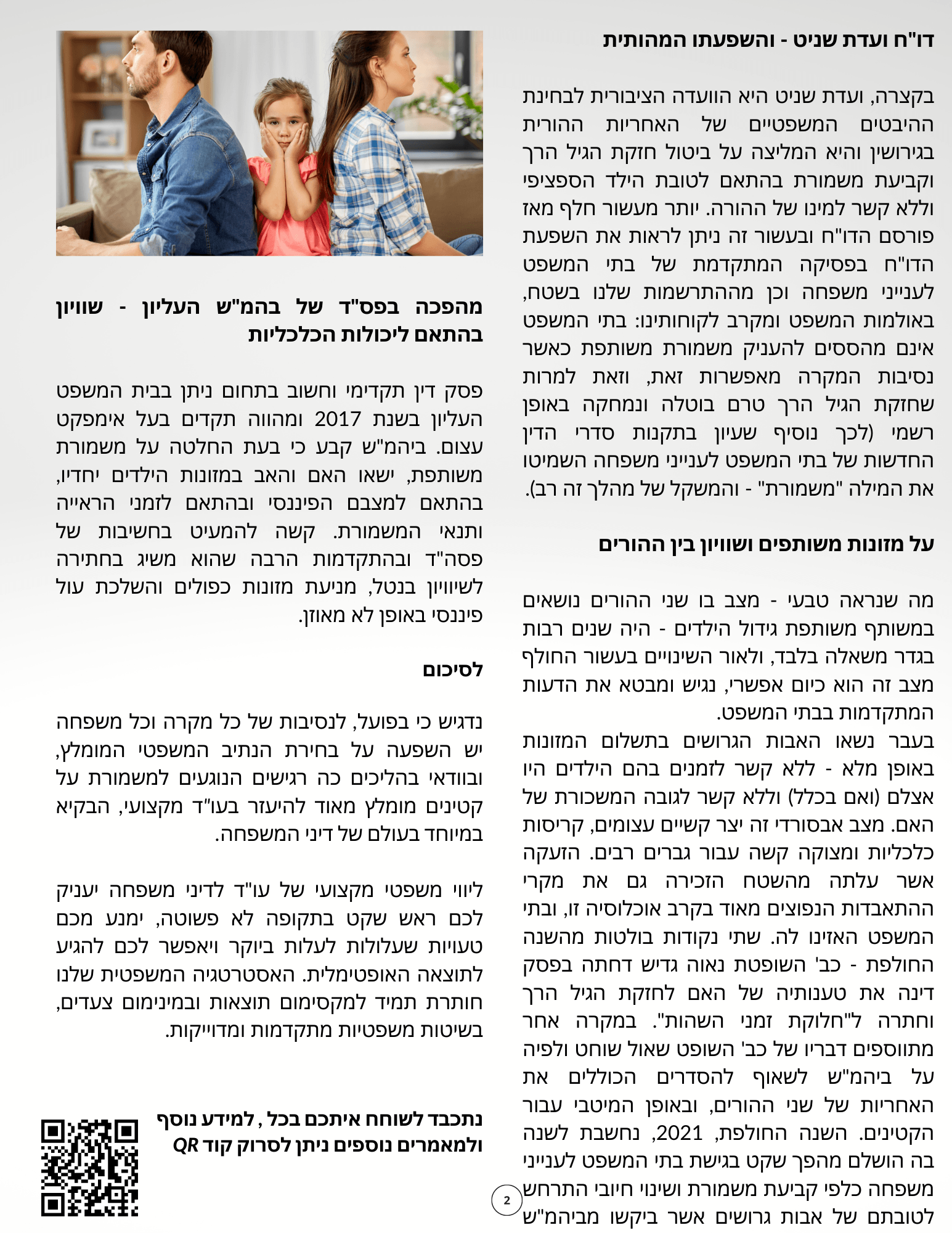בתחום דיני המשפחה, לעו"ד לגירושין יש משקל רב בכל שלב בתהליך מתחילתו ועד סופו - בדגש על גיבוש הסכם שיגן עליכם ועל הילדים. פרידה היא תקופה מורכבת ואמוציונאלית מאוד, וחשוב לעשות את המירב כדי לשמור על הליך מקצועי ויעיל, כזה שיכבד את כל המעורבים ויחסוך כמה שיותר מצוקה מהילדים. משרדנו מעניק לכם ליווי משפטי ואת תחושת הביטחון והגיבוי המקצועית באופן אישי, נגיש ואדיב, לאורך התהליך ועד סיומו המוצלח, בכל הערכאות.